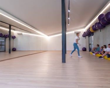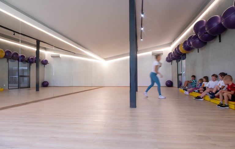 Przestronna i komfortowa – ponad 100m² klimatyzowanej powierzchni z dużymi lustrami i profesjonalnym nagłośnieniem.